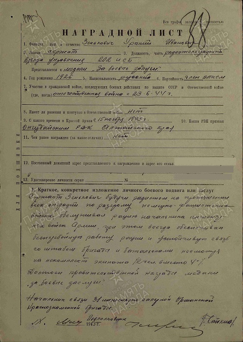 ![]() Зенькович Ураний Иванович, г. Новосибирск, ноябрь 1943 года «Служба в армии и пребывание на фронте составляют важный этап моей жизни, вобравший в себя почти семь лет. Я был призван в Красную Армию со школьной скамьи в возрасте 17 лет 14 октября 1943 года Онгудайским райвоенкоматом Ойротской автономной области Алтайского края. С 18 ноября 1943 года по 8 мая 1944 года учился в Новосибирске на 1-х курсах по подготовке радистов-операторов коротковолновиков, которые с отличием окончил, получив квалификацию радиста 3-го класса и звание ефрейтора, после чего был направлен на 3-й Белорусский фронт. С 15 мая 1944 года служил в 24-м Краснознаменном полку связи 3-го Белорусского фронта в Нарвских казармах города Смоленска, так как войска стояли в обороне и готовились к наступлению по освобождению Белоруссии. Нам было приказано до наступления совершенствовать мастерство радиста. 22 июня 1944 года меня и 7 сокурсников по Новосибирску направили в 31-ю инженерно-саперную бригаду 31-й армии, а 23 июня 1944 года началось стратегическое наступление под кодовым названием «Багратион» по освобождению Белоруссии, в котором с нашей стороны участвовало 2 400 тысяч человек, 36 400 орудий, 5200 танков и самоходных орудий, 5300 боевых самолетов. Наши войска превосходили немецкие в 3-5 раз (особенно по орудиям, танкам и самолетам). В составе 31-й инженерно-саперной бригады я прошел боевой путь от белорусского городка Дубровно на Днепре до города Млада-Болеслав на подступах к Праге, обеспечивал связью части бригады, передавая приказы командования по наведению мостов и переправ, минированию и разминированию полей, рубке просек в лесах для прохода танков, сооружению эскарпов и противотанковых рвов, проходов в проволочных заграждениях и т.д. Почти за год боев передал и принял 2142 радиограммы (данные личной карточки). 31-я бригада была удостоена почетного звания «Оршанская» и награждена орденами Красного Знамени и Кутузова 2-й степени. Я был награжден серебряной медалью «За боевые заслуги», медалями «За взятие Кенигсберга» и «За победу над Германией». Под Кенигсбергом был контужен, к счастью, легко.