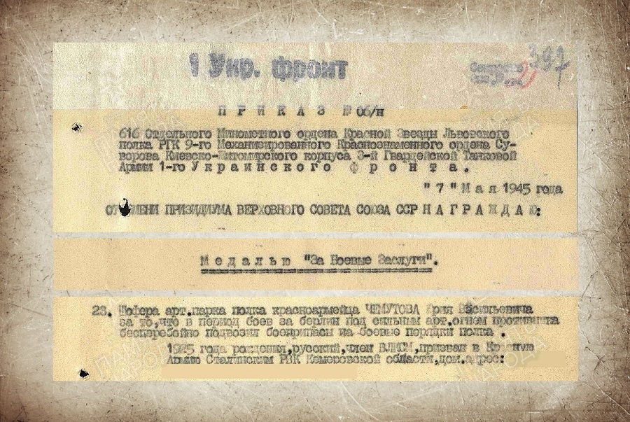 ![]() Юрию Чемутову не исполнилось шестнадцати лет, когда началась Великая Отечественная война. Лишь 11 февраля 1943 года он был призван на военную службу Сталинским городским военным комиссариатом Кемеровской области. Юный защитник Родины Юрий Чемутов участвовал в действующей армии с сентября 1943 года до победного мая в должности шофера 616-го отдельного минометного Львовского полка 9-го механизированного Киево-Житомирского корпуса 3-й гвардейской танковой армии на 1-ом Украинском фронте. В ходе ожесточенных боев за Берлин красноармеец Юрий Чемутов под сильным артиллерийским огнем противника бесперебойно подвозил боеприпасы на боевые порядки полка. Отвага и мужество солдата в решающих боях за свободу и независимость родного Отечества были отмечены медалью «За боевые заслуги».